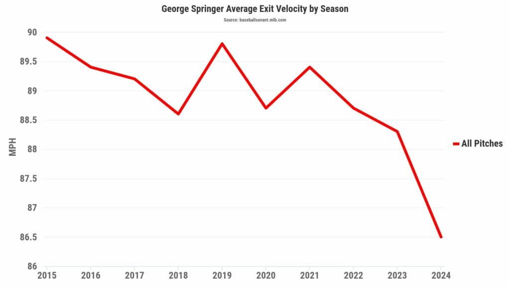In concert with this decline in average exit velocity and average launch angle, Springer’s extra-base hit percentage has taken a sharp dive over the last few years as well. It was a monstrous 12.3% in 2021, then down to 8.8% in 2022, down to 6.9% in 2023, and currently at a career-low 5.6% in 2024.