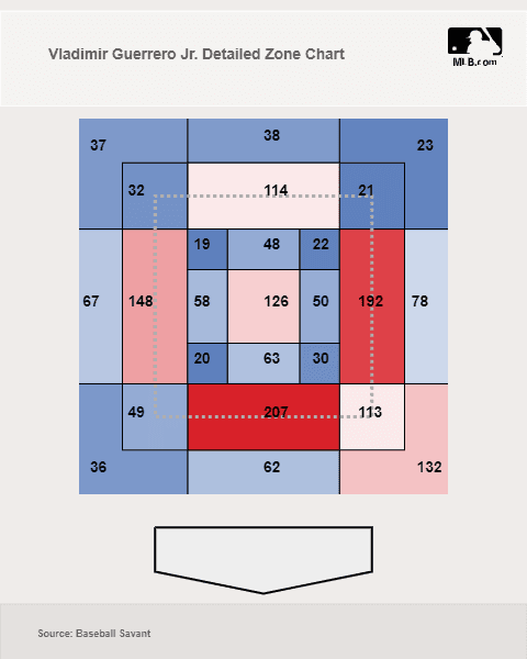 Like any half-decent right-handed hitter, Guerrero was guilty of chasing pitches below the strike zone, as well as going for pitches inside and away. Baseball Savant tracked all his swings in 2019, and lo-and-behold, look at where the bulk of them landed: below the strike zone.