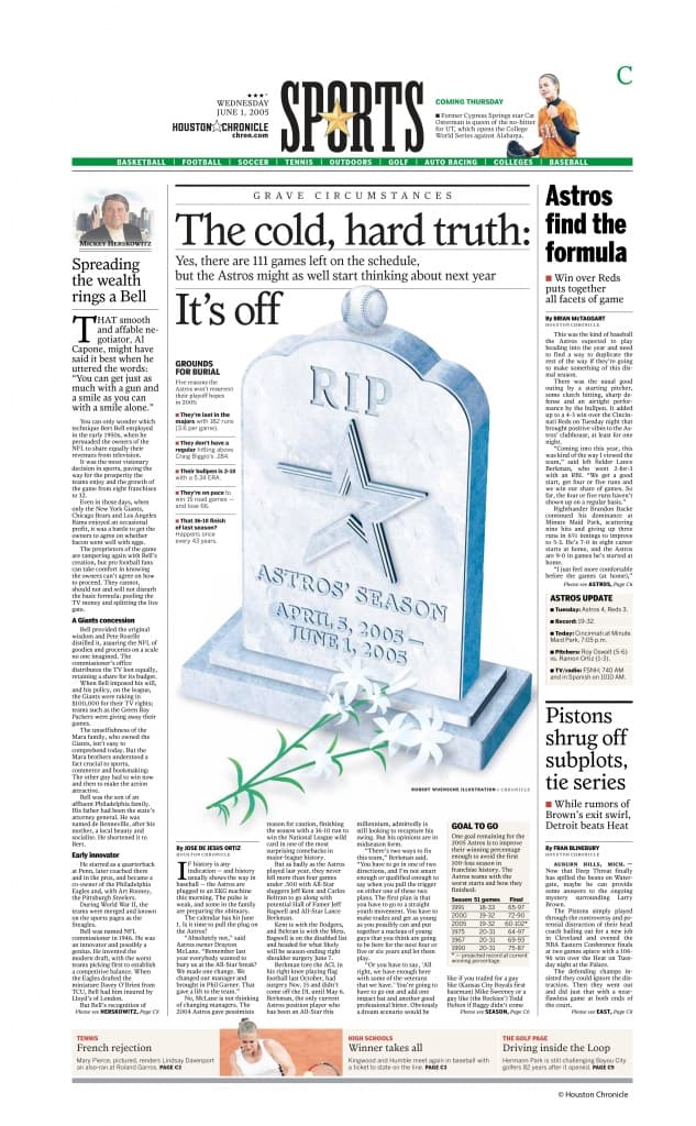On May 30th, 2005, a 42-year-old Roger Clemens started for the sixth place Houston Astros against the Cincinnati Reds. The Rocket did his job and pitched eight shutout innings, only allowing five base runners all night. The problem was, the Reds couldn’t get anybody in and the game went to the ninth scoreless. Once Clemens exited, it took three Astros relievers to pitch the ninth and combined, they surrendered seven runs. Why does this matter? It dropped Houston to 14 games below .500 at 14-32 on the year, well out of the six-team NL Central race and 10.5 back of the lone wild card spot. Two days later, the Houston Chronicle ran this on the cover of their sports page.