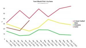 With these changed mechanics we have also seen Kikuchi change his pitch mix throughout his first six starts.