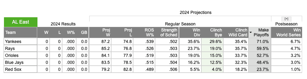 To state the obvious, this is a team that has to make the playoffs. I don’t care that the division’s probably gotten even more difficult, as notable stars like Corbin Burnes and Juan Soto have come over in trades, and young prospects like Jackson Holliday are coming up on the horizon. They’ve made the playoffs two years in a row, and haven’t won a game in them. That has to get better. Missing the playoffs entirely in Vlad and Bo’s 5th full year would be an utter failure. That being said, I do think they’ll get there.