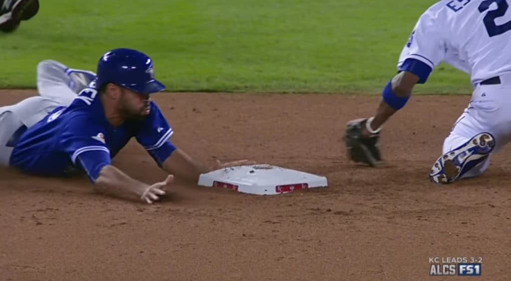 The Royals come to the plate and Alex Rios steals second base, but the Blue Jays challenge the call. The funny thing is he came off the bag, so if Goins keeps the tag on Rios, he’s probably out. But Goins just swiped and walked away. Rios is ruled safe.