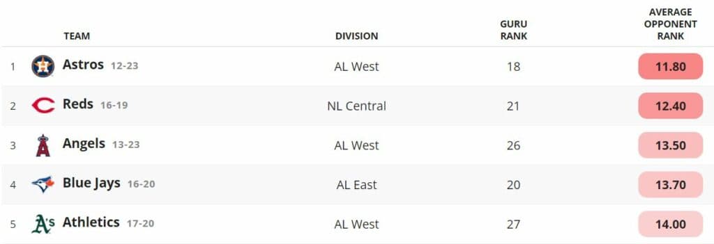 at Power Rankings Guru, they’ve deemed that the Blue Jays have played the fourth-toughest schedule to date in MLB. Only the Astros, Reds and Angels have had it tougher than the Blue Jays to date. Go figure.