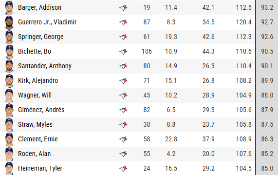 Andrés Giménez, Ernie Clement, Nathan Lukes, Alejandro Kirk, Myles Straw, and even Alan Roden right now (though I firmly believe he has more ceiling than the rest of this group) are all high contact, low strikeout rate guys who run extremely high chase rates which leads to very weak contact that’s also usually on the ground.