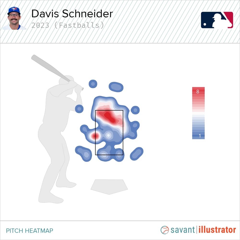 Part of the reason for this could be Schneider’s swing path, which is designed to excel against pitches in the bottom two quadrants. We’ve seen precisely that following his arrival to the Blue Jays, considering nine of his 10 hits have been belt-high or lower.