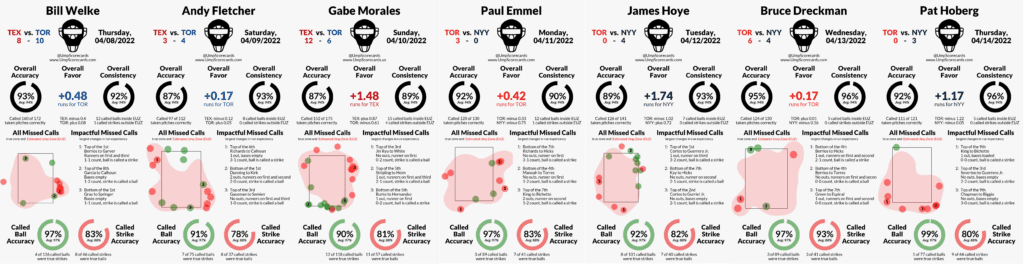 Despite the umpires not being great in any of the games that the Blue Jays have played in, it’s not the reason for their losses. Either their pitching failed them (game three of the Rangers series) or their bats have gone cold. Neither of which are because of the umpire.