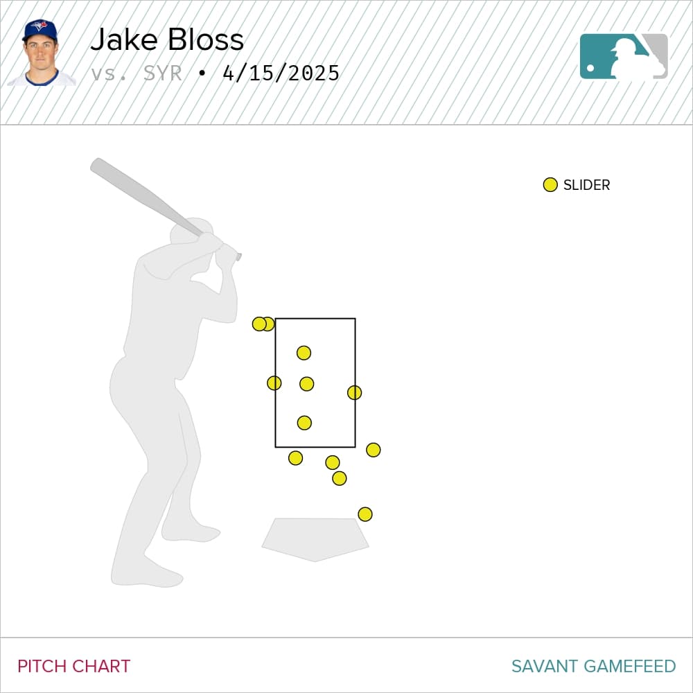 Jake Bloss' early-season woes continued this afternoon with AAA Buffalo. 2.2 IP, 5 H, 7 R, 3 BB, 4 K & 65 pitches (39 strikes) It was smooth sailing until Syracuse's 7-run 3rd inning, which included back-to-back HRs off Bloss. #BlueJays