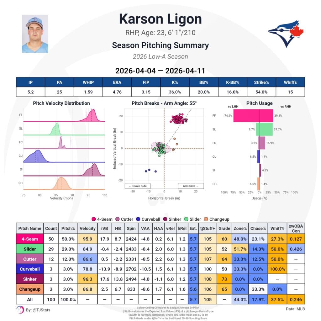 Ligon’s a guy I’d personally heard some buzz on post-draft and into the winter as a guy who was turning heads due to his pitch data. Then again, in spring, I heard the same thing that he was impressing on the Dunedin backfields. I highlighted him and Dylan Watts as two arms I was most interested in getting pitch data on when the A-Ball season kicked off. Neither have disappointed, but Ligon’s data is louder and more diverse.