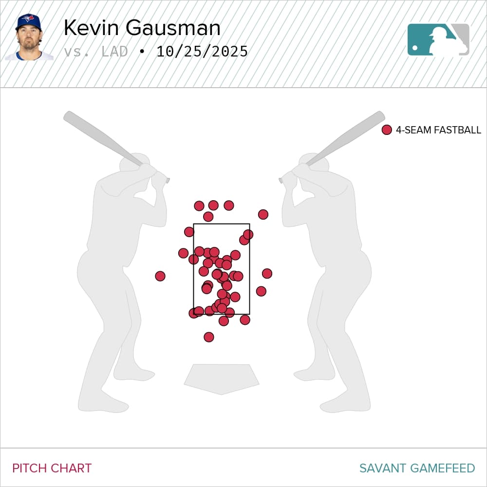 After the Dodgers neutralized Trey Yesavage’s unicorn splitter in Game 1, they didn’t have an answer for Gausman’s, which induced eight whiffs on 13 swings (62 per cent) and was responsible for five of his six punchouts. And he used it just 35 per cent of the time, the lowest usage of his five post-season starts by half a percentage point.