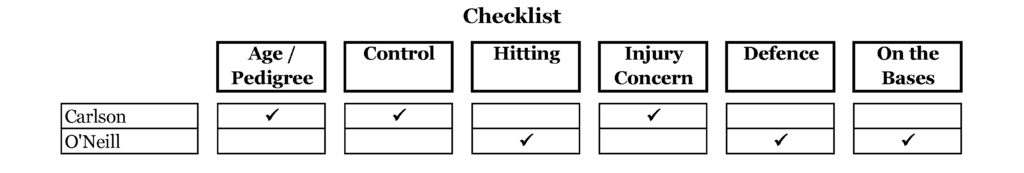 - Both players are capable defenders. However, O’Neill has the edge over Carlson because he has more experience in left field (2,857 innings versus 161).