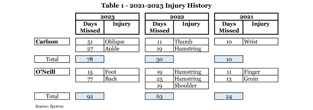 Table 1 summarizes the injuries suffered by Carlson and O’Neill during the 2021-2023 period and the related time spent on the Injured List.