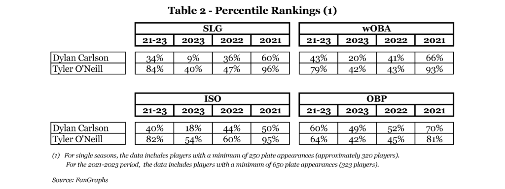 Injuries likely contributed to Carlson’s underperformance in 2022 (99 wRC+) and 2023 (84 wRC+). Similarly, partly because of injuries, O’Neill probably underperformed in 2022 (99 wRC+) and 2023 (97 wRC+). Also, O’Neill missed 22 days with a groin injury in 2018 and 41 days in 2019 with wrist and elbow ailments.