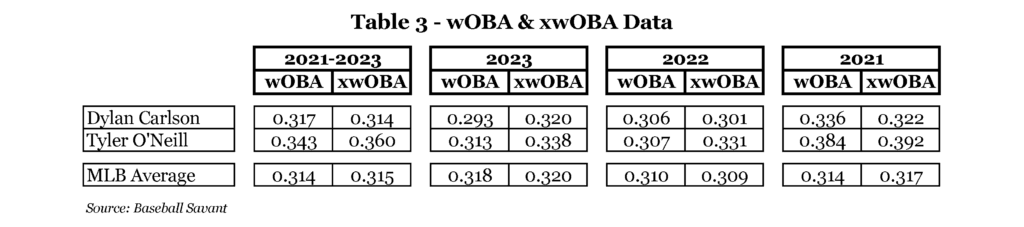 Based on the wOBA and xwOBA numbers during 2021-2023, O’Neill’s expected wOBA was noticeably better than his wOBA, particularly in 2023 and 2022. He appears to be a regression candidate for better OPS days in the future. Given his 2023 xwOBA-wOBA delta, Carlson either incurred some bad luck or perhaps his lingering ankle issue affected his performance.