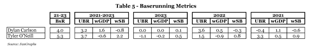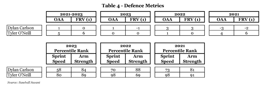 Table 4 shows that both players have been a tick above average defensively. No doubt injuries have hampered their performance with the glove. Regarding Carlson, he is a minus 5 OAA in right field but a plus 7 in centerfield during 2021-2023. Both are capable of, at a minimum, solid defence.