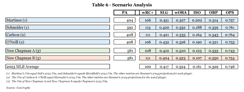 - Third, based on the projections, the offensive ability of New Chapman A or New Chapman B does not vary much if Carlson plays left field for Toronto or O’Neill.