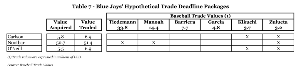 Table 7 summarizes the trade values of Carlson and O’Neill. The reader will observe that Lars Nootbar’s name appears in the table. Nootbar is an excellent outfielder, the type of bat that Toronto and other teams would covet. However, the cost to acquire him would be massive. For example, one package could include Ricky Tiedemann, Alek Manoah and Yosver Zulueta. That is mighty expensive.