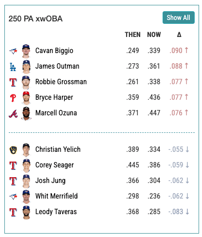 I believe that the front office values defensive versatility above all else for role players, and Biggio offers that to the team. His bat can fluctuate mightily, between batting in the middle of the order at the end of the year to having barely functioning hitting capabilities at the start of it. I think this is best displayed between his 1st half and 2nd half statistics where he batted nearly .300 compared to his .197 first half. He reduced his strikeout numbers while also improving his walk totals. While yes, he only hit two home runs during the second half, his overall RBI numbers were higher than in the first half. This screenshot shows Biggio’s xwOBA which he ranked first displaying his quality of contact to end the year.