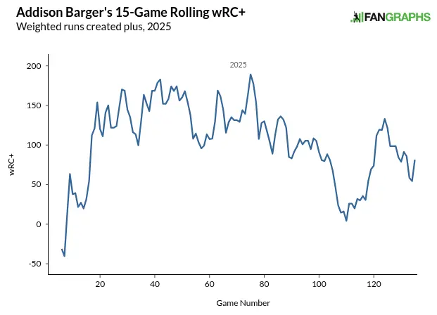 Overall, Barger finished his breakout ’25 campaign with a promising 21 home runs and 74 RBIs, along with a .243/.301/.454 slash line and 107 wRC+ — putting him seven per cent above the league-average score of 100. All things considered, it was a massive swing — quite literally — from the .197/.250/.351 line and 69 wRC+ that he submitted over 69 games during his underwhelming 2024 season.