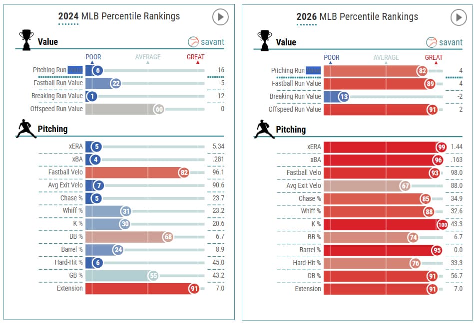 In the span of two years, it’s wild to see his Baseball Savant pages change this drastically in a short period. Kudos not only to Varland for reinventing himself, but also to the Blue Jays’ pitching coaches like Pete Walker and assistant coach Sam Greene for kicking Varland’s game into high gear.