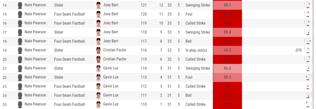 Looking down the entire list of Pearson’s pitches looks just like a red-stained stat sheet with all the velocity he was delivering tonight.