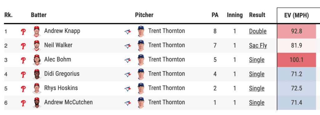 - In Game 2, Trent Thornton made his return from the Injured List and, uh, it did not go well. Andrew McCutchen and Rhys Hoskins hit soft singles to kick things off, then Bryce Harper took a walk, and Didi Gregorious smacked another soft single. Eventually, Thornton looked like he just ran out of gas the Phillies started to tee off on him. All told, Thornton allowed six earned runs on five hits and a walk while recording just two outs.