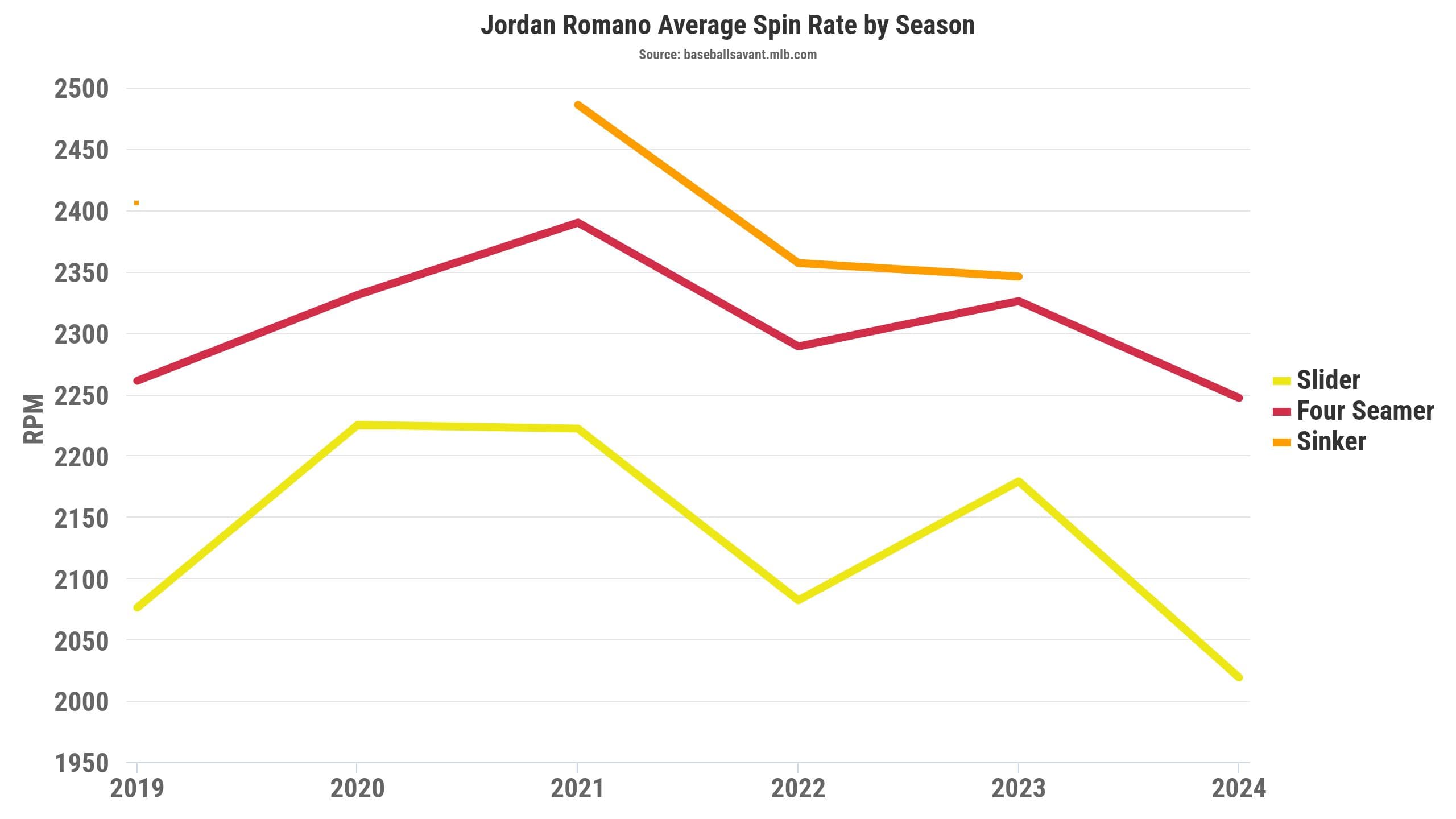 That ailment didn’t impact Romano’s velocity during his brief time with the Blue Jays, spanning only 13.2 innings before throwing his final pitch on May 29. But, it did have a negative outcome regarding his spin rate, with his four-seamer losing almost 80 RPMs and his slider dropping by 160 RPMs in 2024.