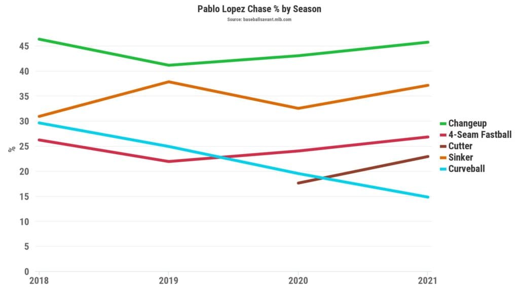 Digging deeper, Lopez excelled at enticing opposing hitters to chase outside the strike zone, earning him a 33.3% chase rate, which ranked in the 94th percentile among all pitchers in the majors. Additionally, those same batters whiffed 38.3 percent of the time when they extended the zone, an increase of 5.2 percent from 2020.