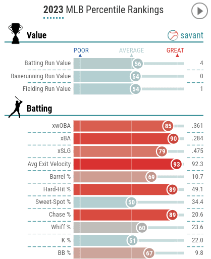 From a pure hitting-the-crap-out-of-a-baseball standpoint, there are few better alternatives available than Soler, whose 2023 Baseball Savant player card is covered in bright red thanks to his dazzling quality of contact metrics.