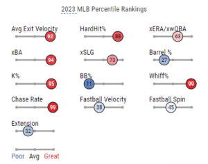 Even in 2023, Richards is having a good start to the season. His 5.14 ERA is elevated, but prior to being brought out for a third inning of work this past Tuesday, his ERA sat at 3.24, which is actually quite solid. Not just that, but his 4.24 FIP isn’t too bad, and he has the highest K% of 35.4% on the roster. His 13.8 BB% is on the high side though. Even then, here’s his Baseball Savant page. A whole lot of red where it matters.