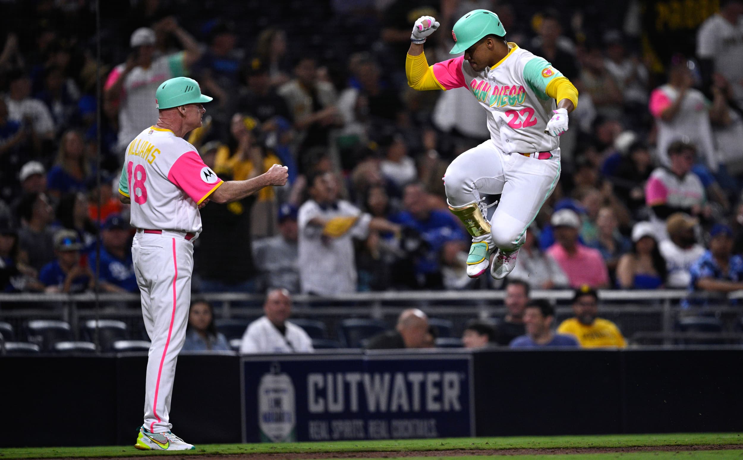 Aug 4, 2023; San Diego, California, USA; San Diego Padres left fielder Juan Soto (22) celebrates with third base coach Matt Williams (18) after hitting a home run against the Los Angeles Dodgers during the ninth inning at Petco Park.
