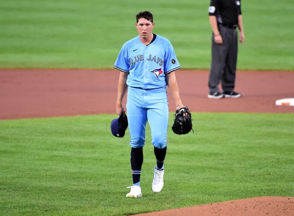 Aug 18, 2020; Baltimore, Maryland, USA; Toronto Blue Jays pitcher Nate Pearson (24) reacts after giving up a home run in the first inning against the Baltimore Orioles at Oriole Park at Camden Yards. Mandatory Credit: Evan Habeeb-USA TODAY Sports