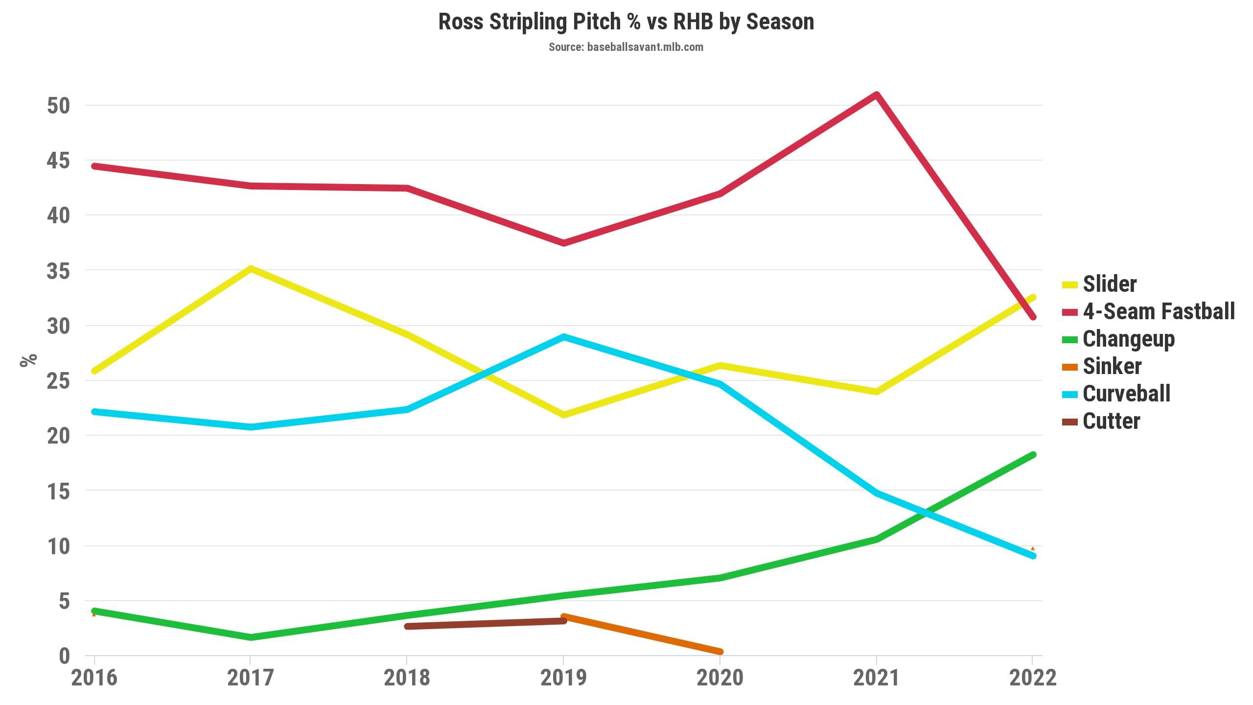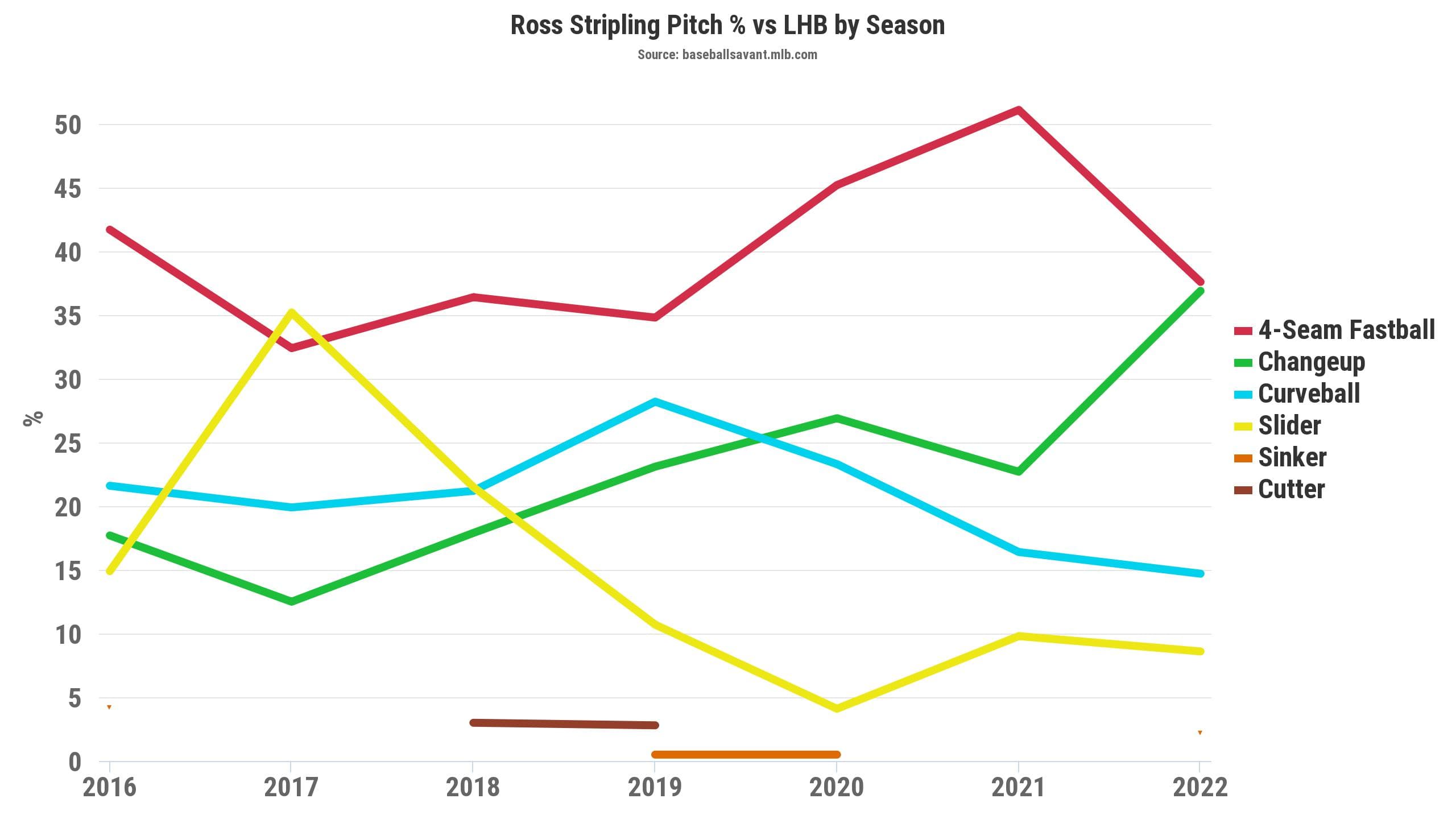 When facing a right-hander, though, Stripling’s slider becomes a much larger piece of his arsenal as he’s utilizing it 32.5 per cent of the time in ’22. Along with his breaking ball, he’ll also heavily feature his four-seamer and changeup while mixing in his curveball and two-seamer.