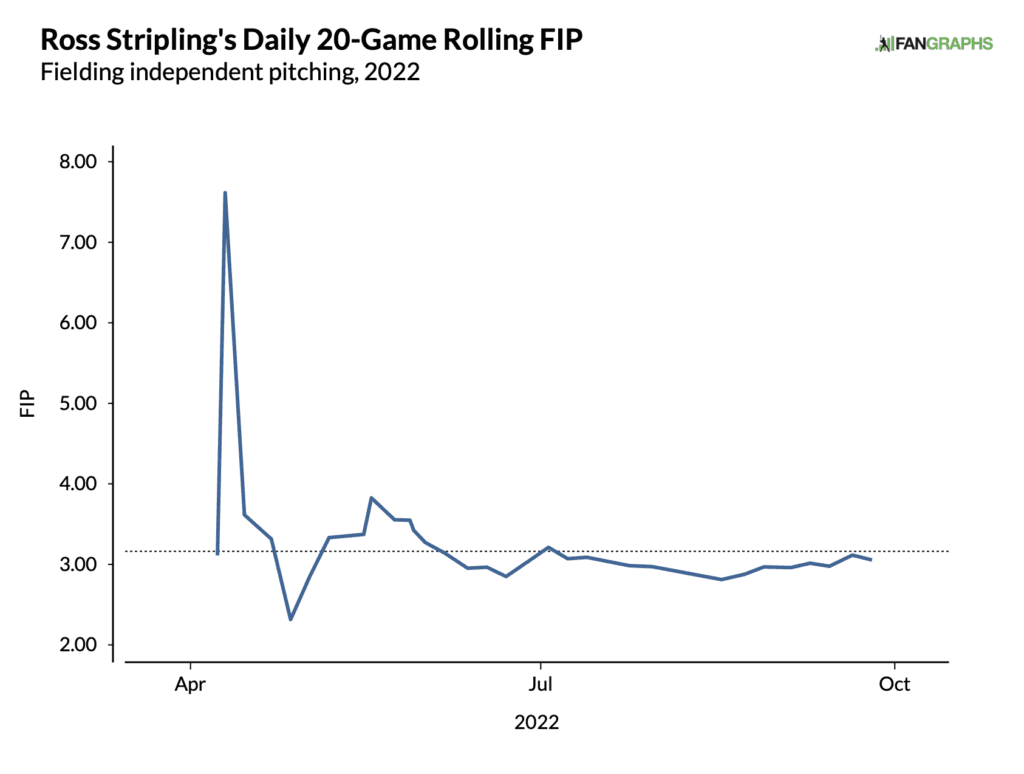 The short answer is, yes. The long answer? Well, Ross’s got a 3.12 FIP, which is 21st among pitchers who’ve tossed 130 or more innings in 2022. Not only that, but that 3.12 FIP outshines some of the league’s top pitchers, including Framber Valdez, Cristian Javier, Alek Manoah and Corbin Burnes. That’s some pretty good company. Stripling’s xFIP, which is FIP but with normalized home run rates, isn’t much worse. It sits at 3.66, which is a better mark than Julio Urias, Patrick Sandoval, and again, Alek Manoah. Strip’s groundball rate is 39th, ahead of guys like Spencer Strider, Kevin Gausman and Dylan Cease. He doesn’t strike out a lot of batters, but he doesn’t walk many either, and as a result, his K-BB% is 34th. It’s ahead of other pitchers like Frankie Montas, Kyle Wright, and yet again, Alek Manoah. The point? There’s no reason to think that Strip will suffer major regression in the future, just because he doesn’t throw hard. Even in today’s game, plenty of soft tossers have had long term success. Logan Webb only throws about 93 MPH on the fastball, and he’s been a fantastic pitcher for two years running now. Shane Bieber has an even slower fastball than Strip, and he just put up another 5 WAR season.