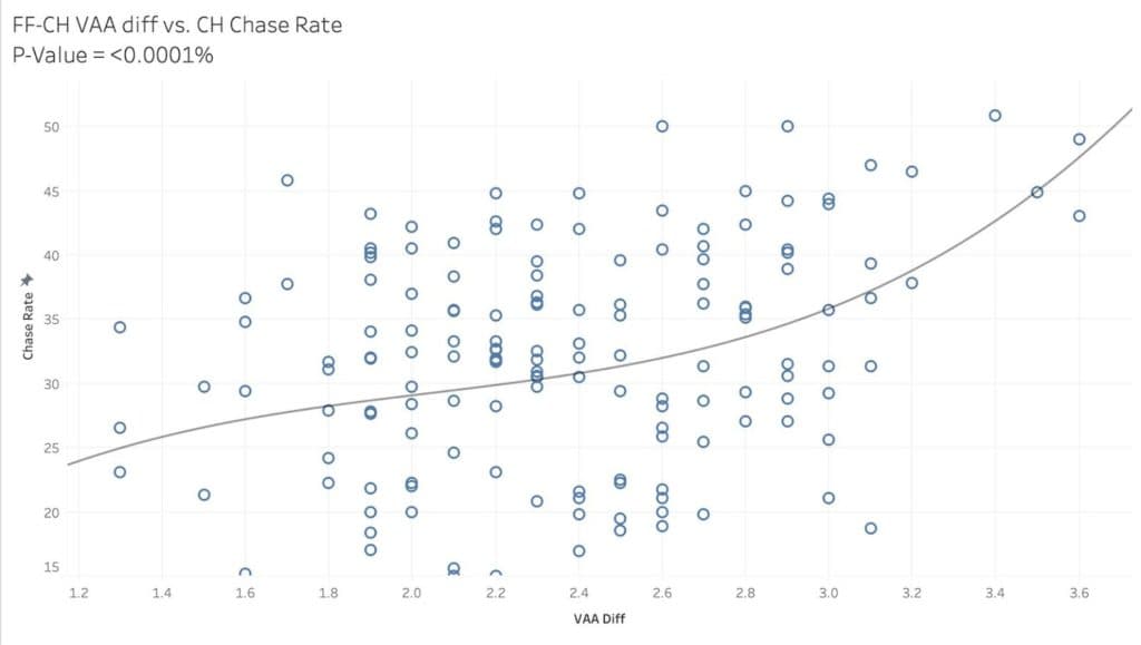 So, then what does create strong fastball-changeup tunnels? Well, one important aspect is a VAA (vertical approach angle) separation from the four-seam fastball. In other words, VAA is the angle at which a pitch approaches the plate. Here’s a graph that illustrates the relationship between VAA difference and changeup chase rate.