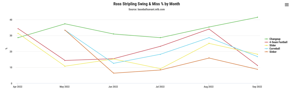 Ross Stripling simply is not the same pitcher he’s been in the past. I’m aware that his ERA last year was 4.80, I’m aware that pitchers have a huge tendency to eventually regress to the mean. However, past years are not representative of Stripling’s mean. He has massively increased his changeup usage in 2022, and there’s no reason to expect that to change in the future. He’s steadily decreased the curveball usage ever since joining the Blue Jays, and there’s no reason to expect that to change in the future. It’s as if you’ve got a whole new pitcher on your hands. You should only be looking at regression indicators from this year to predict whether or not the aforementioned actually does occur. So, let’s do that. Do Ross Stripling’s peripherals look as good as this changeup does?
