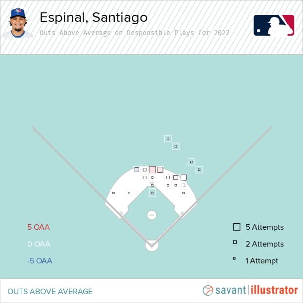 Overall, Espinal has logged 125 1/3 innings at second base in ’22, registering a remarkable +4 DRS and a +3 OAA rating. Last season, he finished with a +8 DRS and a +5 OAA rating at third base across 551 2/3 innings.