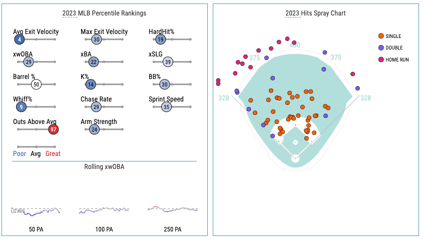 Watching DeJong’s at-bats, you’ll notice his ability to make contact with any pitch placement, he’s able to protect the lower part of the zone and below, fighting off low-changeups and putting those balls in play on a short game. If he does get beat, it’s the high and in the heater. He uses all fields and will place base hits almost anywhere, where his power is ignited comes when the pull-side is activated and will occasionally stick center or left-center. His overall use of the entire field and ability to go the other way is above satisfactory. DeJong will naturally see more breaking pitches due to his hitting style, where he can win in at-bats is hacking at a first-pitch strike, fastball preferably. This season he has a 33% first-pitch swing rate compared to a 64% first-pitch strike rate.
