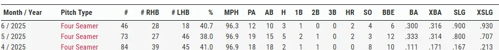 Opponents could barely touch Hoffman’s four-seam fastball during his electric month of April, but the league has since caught on, and that pitch is no longer as effective as it once was. Month-to-month, opponents slugged .167 on Hoffman’s four-seamer in April, .800 in May and now .900 in June.