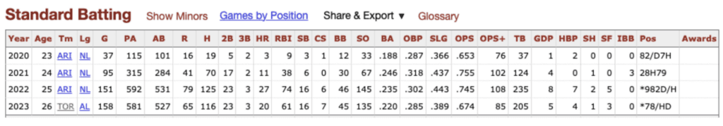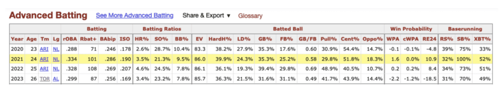 The case for his batting bounceback is easier to understand when we observe his career stats in 2020 and 2021 with the Diamondbacks. Varsho didn’t have the best debut year when he started with Arizona in 2020, but his 2021 stats show his great offensive progression with a 0.755 OPS. The truth is that Varsho may not reach 0.800 or 0.900 OPS. But it’s safe to assume that he has the potential to reach the OPS in the 0.700s again given the historical data.
