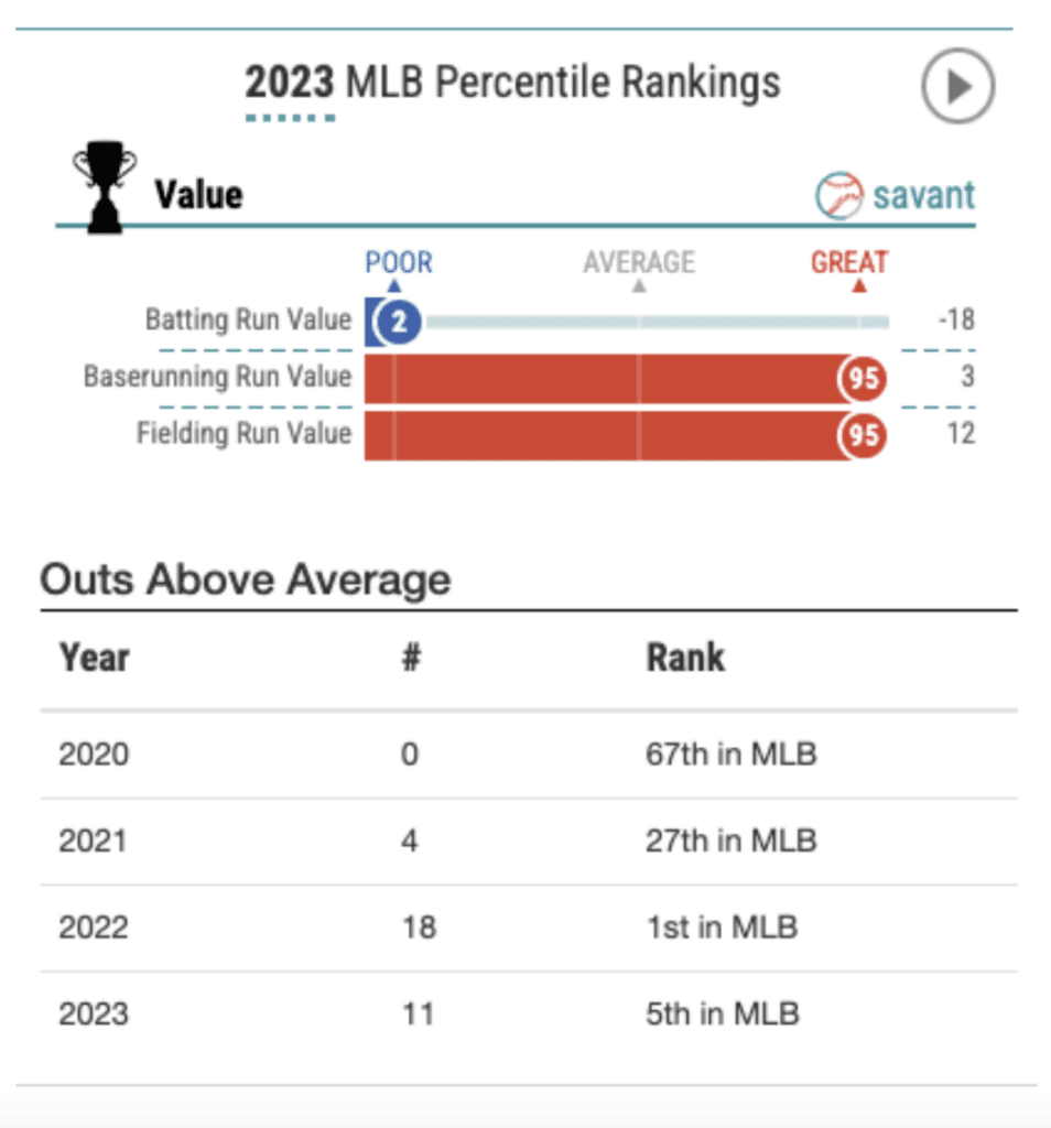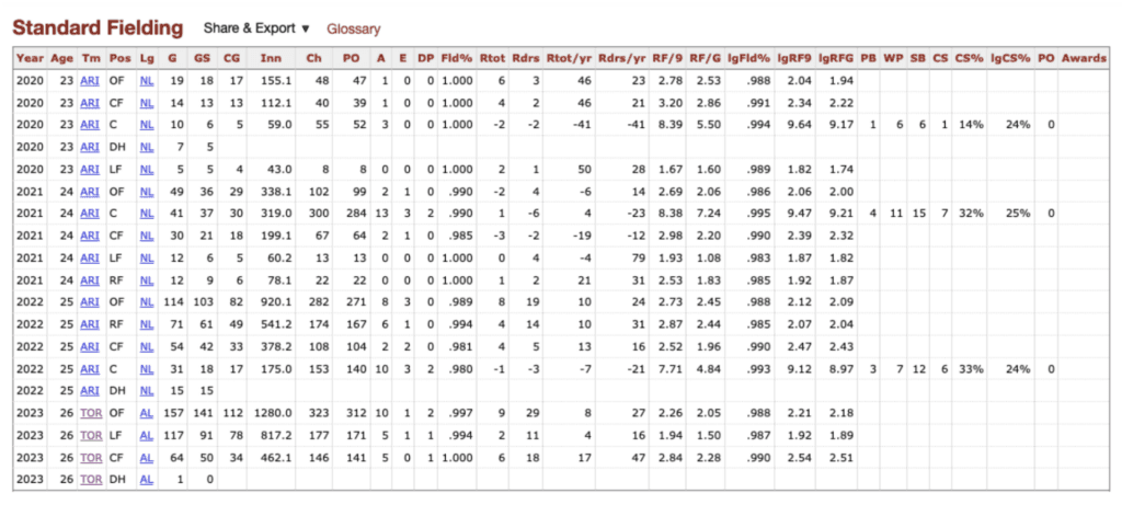 Varsho’s fielding percentage is also outstanding at 1.000 compared to the MLB average of 0.986 in 2023 per Baseball Reference. While there’s no guarantee that Varsho can recreate his defensive values next season, it’s reasonable to believe that he can certainly keep similar statistics barring any unusual circumstances.