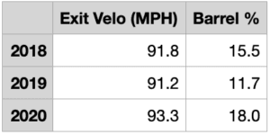 How has he done it? To sum it up quickly, he’s made better contact. He was already a Statcast darling prior to 2020, with an 92nd percentile exit velocity and 97th percentile Barrel % in 2018, and 86th and 82nd percentiles respectively on those statistics in 2019. In the pandemic-shortened 2020, he’s at 97th and 99th. What that looks like in terms of actual data is this: