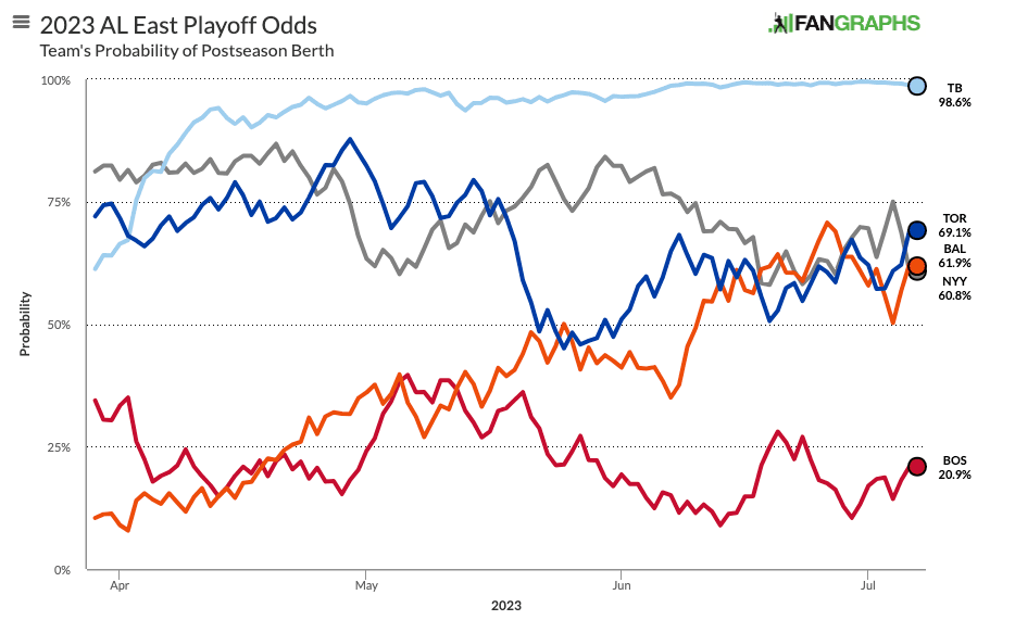 The Jays’ chance of making the playoffs dropped precipitously at the end of May, going from nearly 75% to 45%. The team then had one of the best June records in the American League, climbing 10 percentage points back up, but it’s still bleak. Following this week’s sweep of the Chicago White Sox, they’ve climbed back up to just a shade under 70 percent, right around where the Yankees and Orioles are.