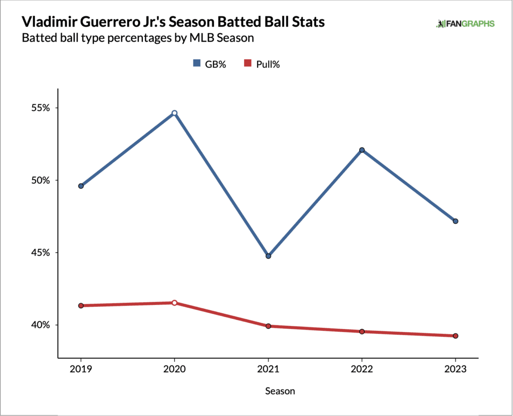 The elder Bichette claims that getting out in front of the ball somehow equates to loft, an issue that’s been plaguing several Jays hitters, including Vlad Guerrero. The first baseman has long had trouble getting the ball off the ground, something that’s been hurting his performance in the last two years especially. However, when we look at the data, there’s no correlation between his Pull% (being early will CERTAINLY cause you to pull the ball because, at that point, your swing path is angling the ball toward the pull field) and his GB%.