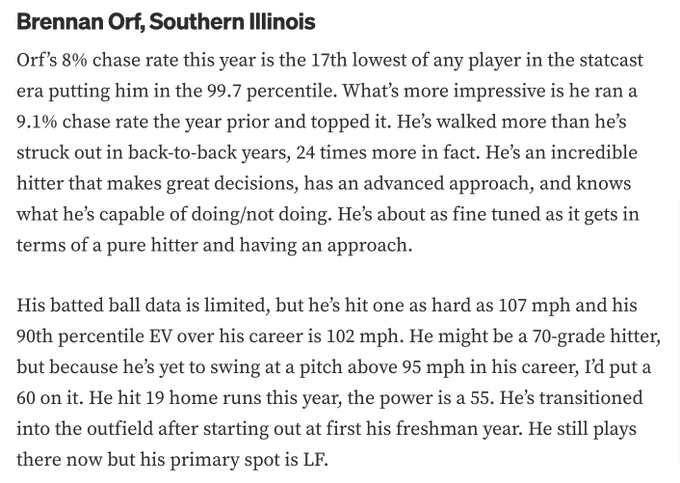 He was also teammates with undrafted signee Bryce Arnold with the Frederick Keys in the MLB Draft League. There, Orf slashed .333/.529/.500 with no homers in 34 plate appearances. For his entire summer league career, he slashed .293/.432/.466 with six homers in 294 plate appearances.