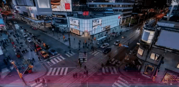 I don’t think it’s an accident that we see the striping carried into the rest of the City Connect teaser video. A few moments later, we see the scene change to Yonge-Dundas Square, again with that striped gradient at the bottom.