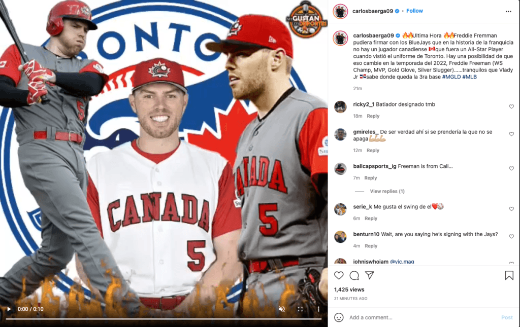 Over on Instagram, former All-Star Carlos Baerga posted this image with Freddie Freeman wearing his Team Canada uniform in front of a Toronto Blue Jays logo. In the post he said that Freeman could sign with the Blue Jays.