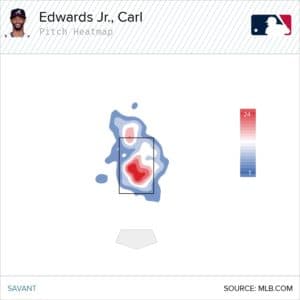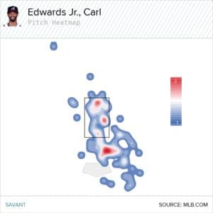 Fastballs right over the heart of the plate and curveballs nowhere near the strike zone is not a recipe for success. However the tools are that that give you hope Edwards Jr. might be able to right the ship. He doesn’t throw very hard averaging just over 93 mph, but what he does is generate a ton of spin on his fastball. Since 2017, among pitchers who threw at 500 four-seam fastballs, Edwards Jr. spin rate of 2663 rpm ranks fourth, per Baseball Savant. Edwards Jr. doesn’t throw his fastball very hard, averaging just over 93 mph. This combination of low velocity, high spin give Edwards Jr. a very high Bauer Unit (spin rate/velocity). His Bauer unit of roughly 28 is well above the league average of 24. This means Edwards Jr. should be throwing his fastball up in the zone.