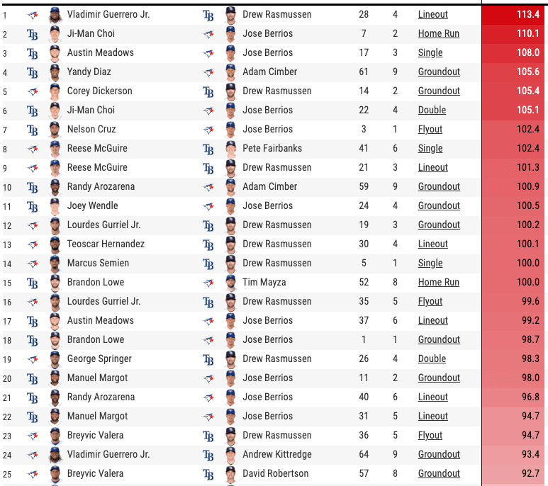 The Blue Jays had 12 of the 25 hardest-hit balls on Tuesday and most of them were hit right at somebody, like Vladdy’s 113 miles-per-hour lineout and Corey Dickerson’s 105 mile-per-hour groundout. Frustrating stuff, but, such is life when you face the Devil Rays with the Devil Magic.