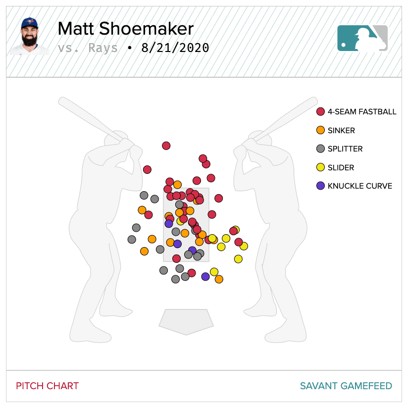 - Matt Shoemaker started for the Blue Jays and had himself a pretty solid outing. Given the fact that this was Shoemaker’s third outing against the Rays this season, he and Danny Jansen went with a much different strategy than usual. Shoemaker threw his fastball 63 percent of the time on Friday, which is much more than he generally ever uses it. Shoemaker also saw a slight uptick in velocity, as he reached as high as 93.5 mph with the heater. All told, he went five innings, scattering two runs (both solo homers) while striking out six.