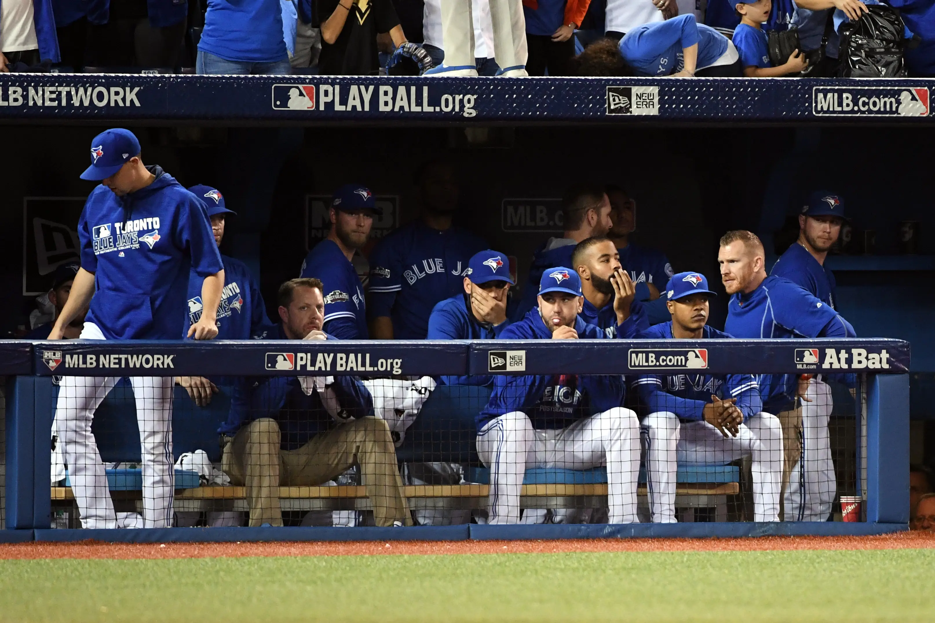 Oct 19, 2016; Toronto, Ontario, CAN; The Toronto Blue Jays react after loosing to the Cleveland Indians in game five of the 2016 ALCS playoff baseball series at Rogers Centre.